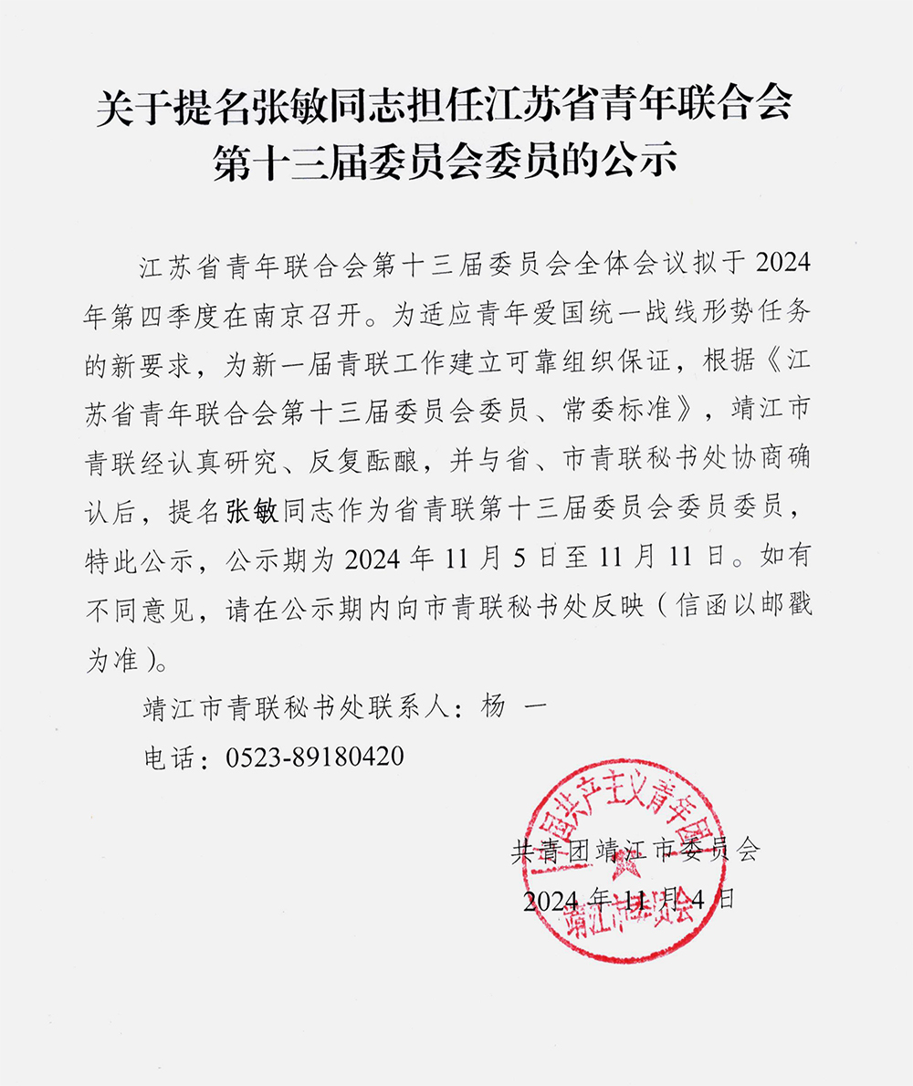江蘇省青年聯(lián)合會(huì)第十三屆委員會(huì)全體會(huì)議擬于2024年第四季度在南京召開。為適應(yīng)青年愛國(guó)統(tǒng)一戰(zhàn)線形勢(shì)任務(wù)的新要求,為新一屆青聯(lián)工作建立可靠組織保證,根據(jù)《江蘇省青年聯(lián)合會(huì)第十三屆委員會(huì)委員、常委標(biāo)準(zhǔn)》,靖江市青聯(lián)經(jīng)認(rèn)真研究、反復(fù)醞釀,并與省、市青聯(lián)秘書處協(xié)商確認(rèn)后,提名張敏同志作為省青聯(lián)第十三屆委員會(huì)委員委員,特此公示